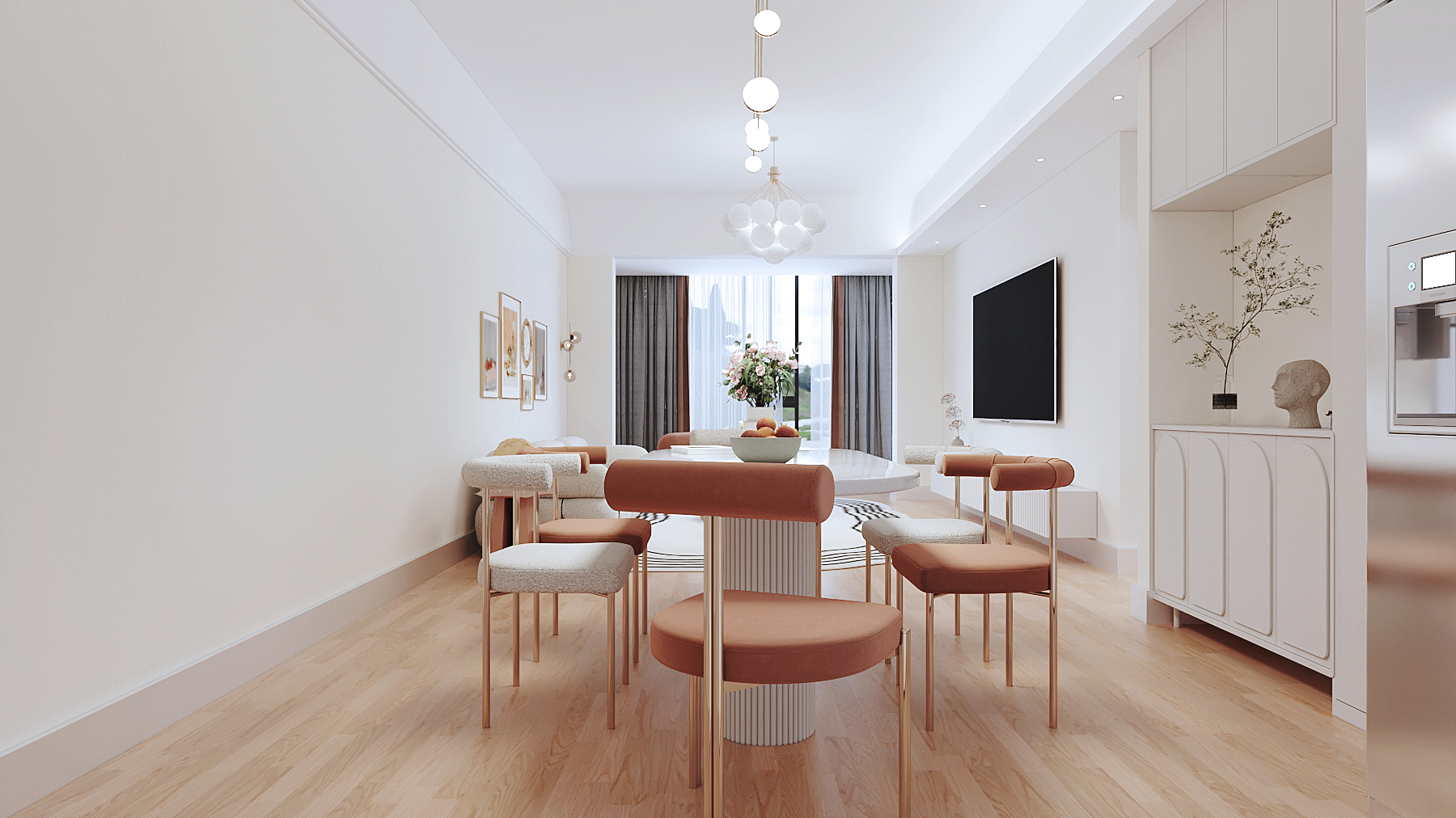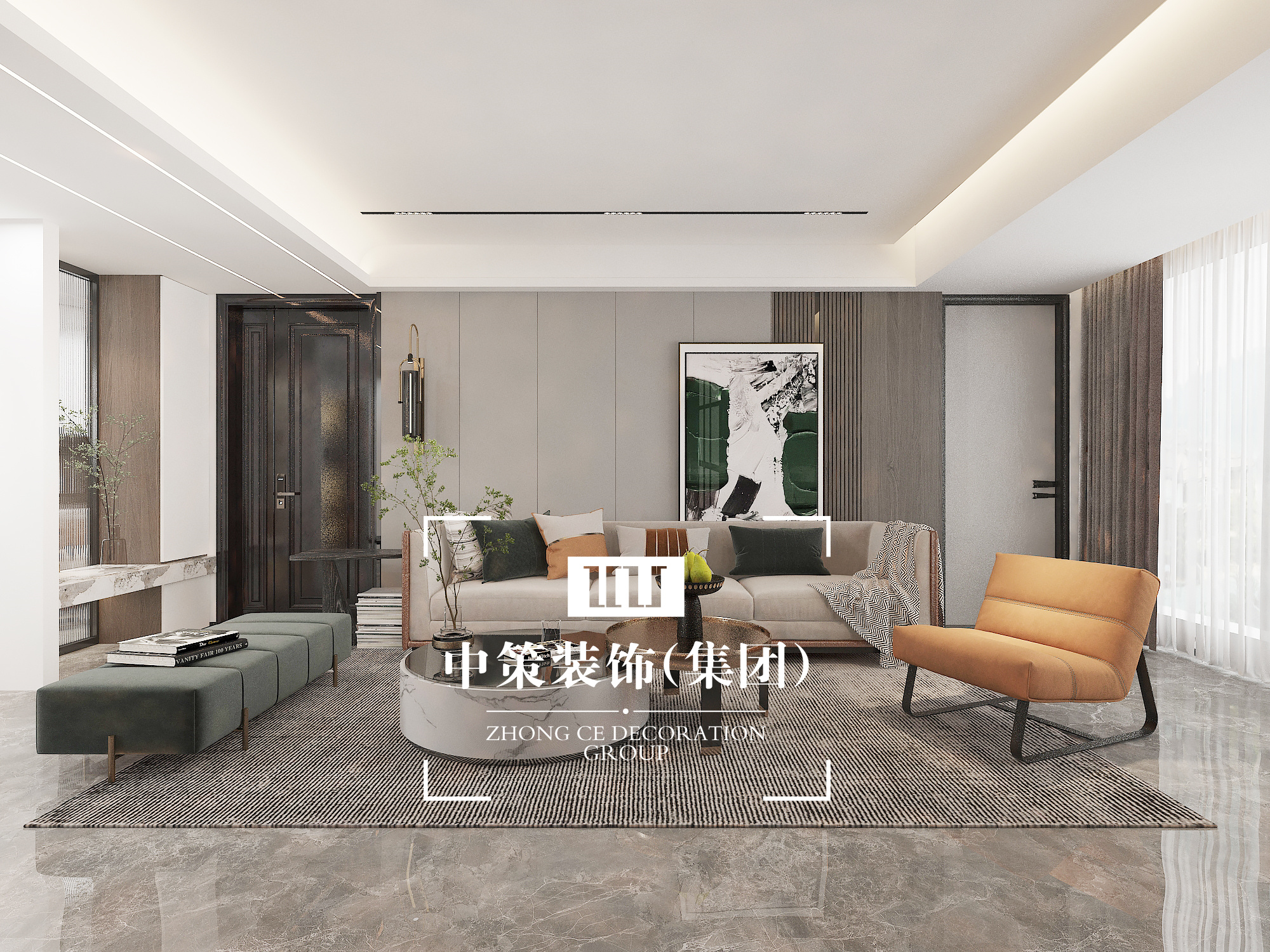 沒有過于搶眼的造型,亦沒有豐富色彩的疊加,而是以最典型的現代簡約風格,令所有的色調統一,同時,細節處流露出精致的生活格調。 簡潔、大方是映入眼簾的第一印象,現代的經典家具、美麗的織物和花束,使得客廳成為享用下午茶、休閑放松的完美場所。客廳空間的家具以金屬、皮革的中性色調為主,造型簡潔,線條流暢,用高純度的橙色傳遞細膩的質感,搭配頂上的圓弧形不銹鋼線條,使得整個空間靈動又舒適;造型簡潔、線條流暢的家具組合搭配,營造出穩定、協調、溫馨的空間感受,滿足現代年輕家庭的輕奢需求。