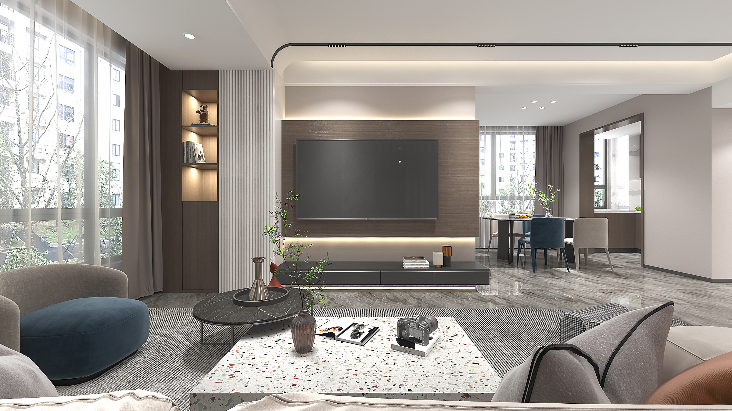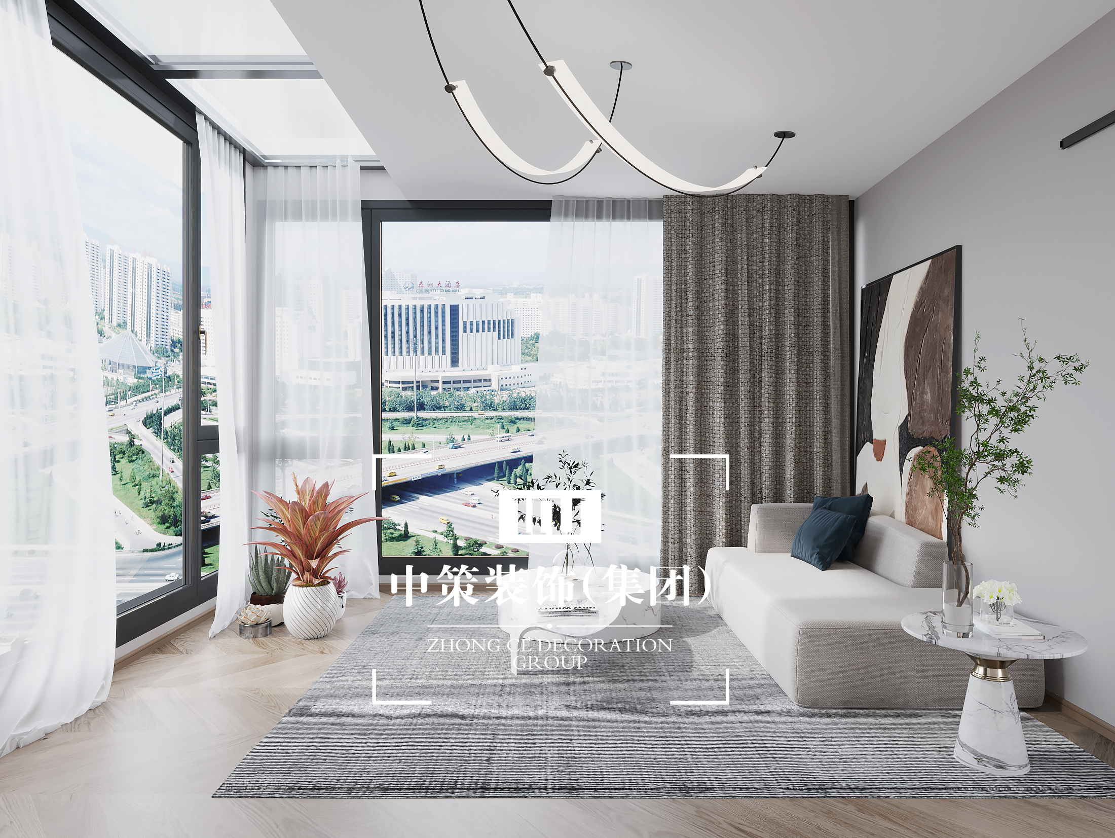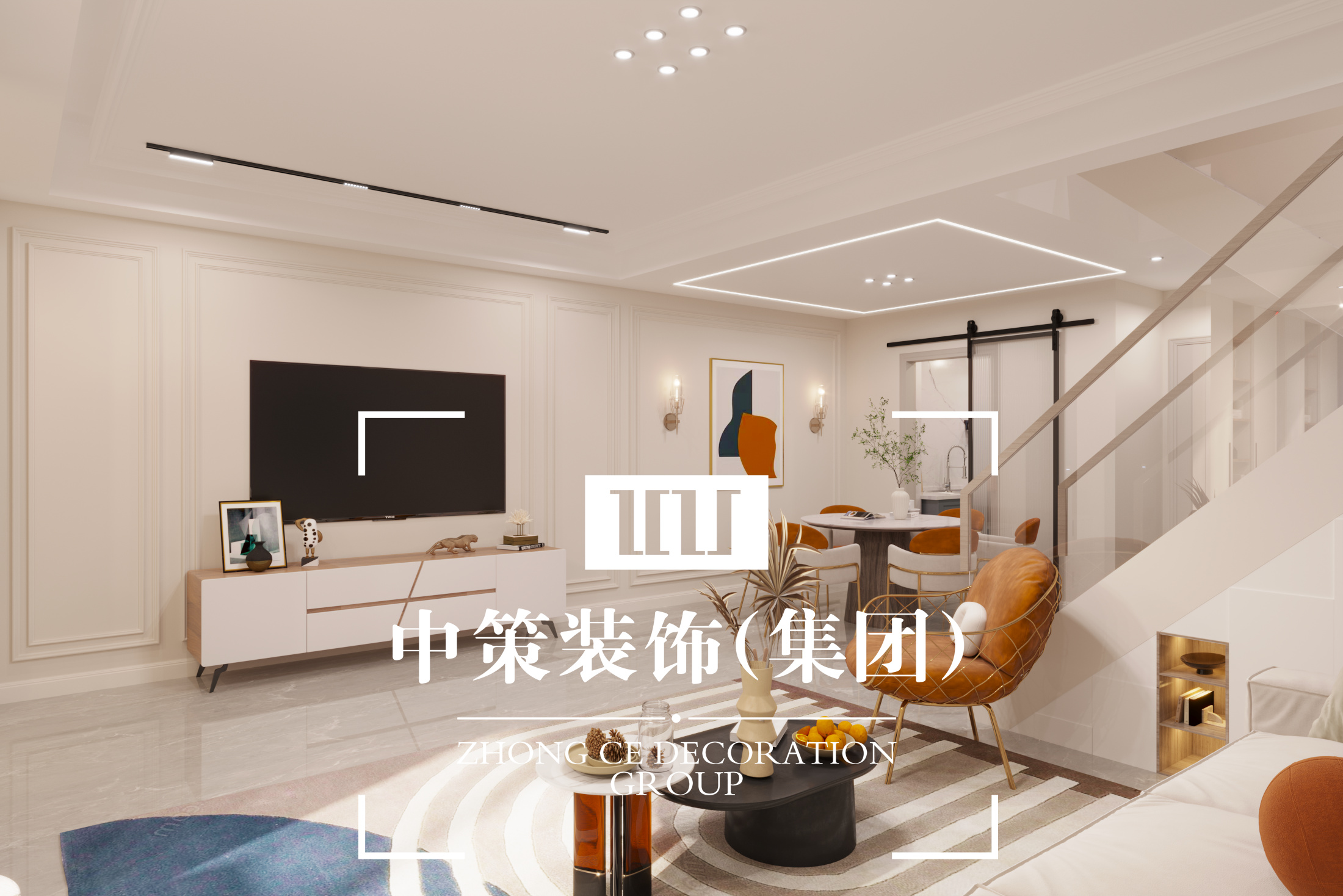 現代簡約中離不開金屬燈罩、玻璃燈、高純度色彩、線條簡潔的家具、到位的軟裝。同時考 慮到業主家里還有兩個年幼的孩子,安全應該放在首位,所以就將玻璃燈只吊在了頂棚,避免別 的地方的使用帶來安全隱患。電視背景墻上的軟包,實惠又大方,同時不失時尚,是不錯的選擇。