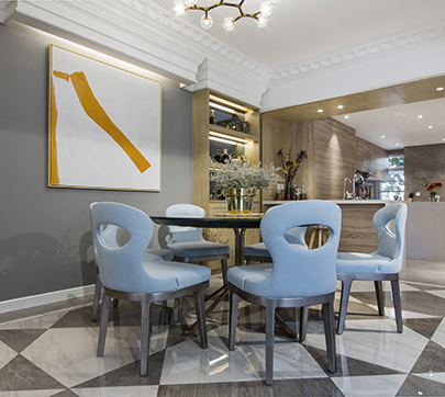 打破空間的沉悶感,使空間更加通透,并且呈現出冷暖、深淺不一的視覺效果,藍白相間裝飾畫,也為空間增加了色彩的節奏感,讓空間更富意趣。
