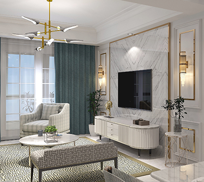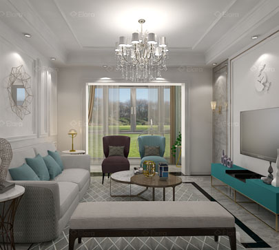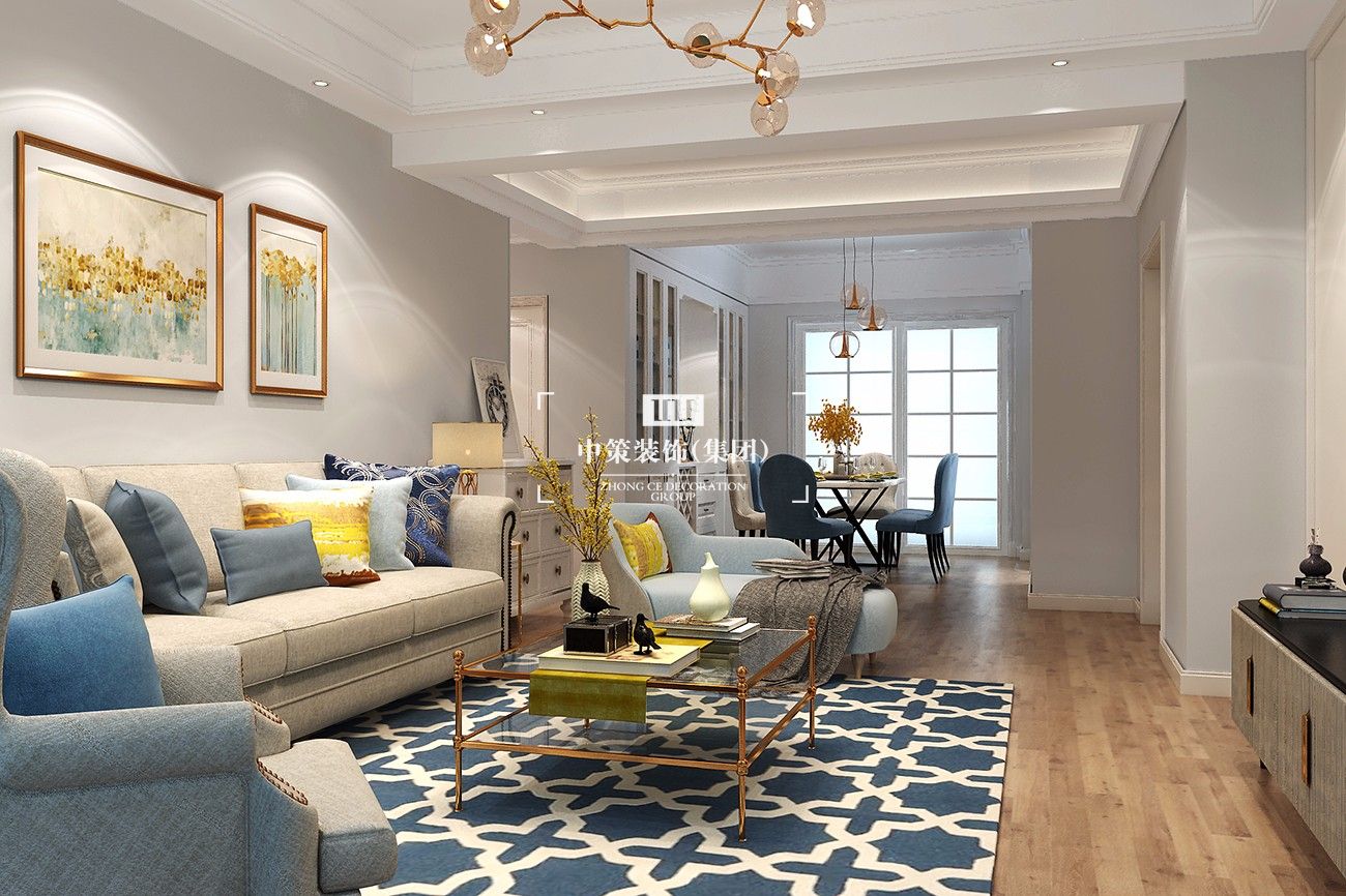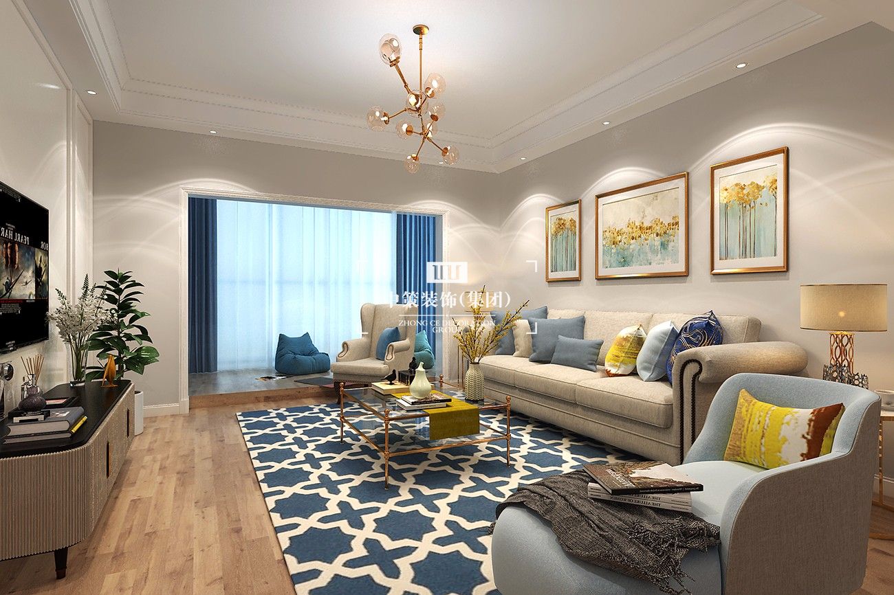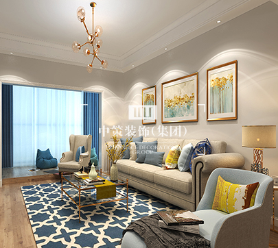 本案為現代簡歐風格,去繁就簡,沒有采用歐式傳統的羅馬柱等元素,只留下簡單的線條和幾何圖案,融入一些大自然的色彩,讓整個空間營造出時尚、高貴、輕松、愉悅的視覺感,營造出一個樸實之中的時尚簡歐家居設計。