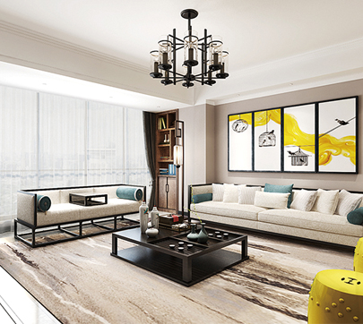 精致的金屬擺件、燈具與沙發、裝飾畫中的黃色塊面互相呼應,從細節上抓人眼球。