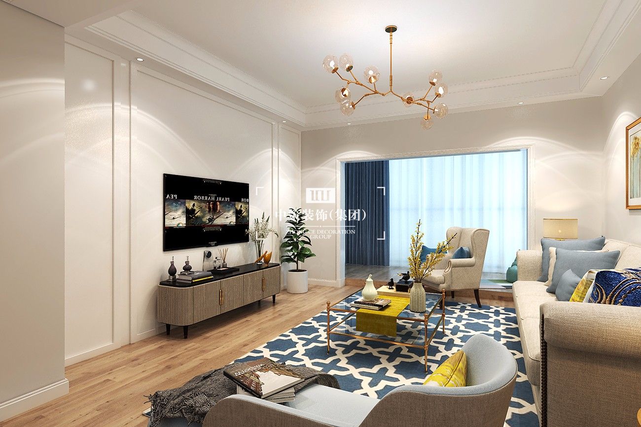 現代簡約中離不開金屬燈罩、玻璃燈、高純度色彩、線條簡潔的家具、到位的軟裝。同時考 慮到業主家里還有兩個年幼的孩子,安全應該放在首位,所以就將玻璃燈只吊在了頂棚,避免別 的地方的使用帶來安全隱患。電視背景墻上的軟包,實惠又大方,同時不失時尚,是不錯的選擇。