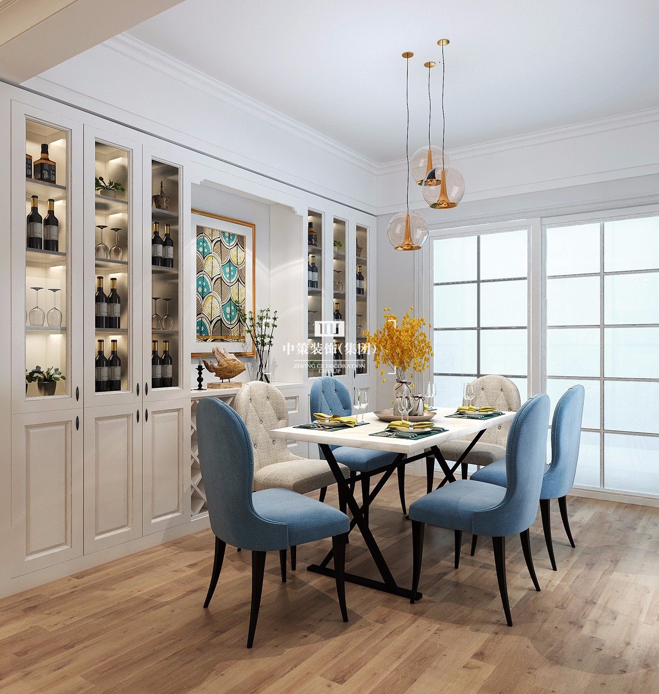 餐廳做了定制的裝飾性儲物柜,增加儲物功能的同時又滿足了美觀上的需求。