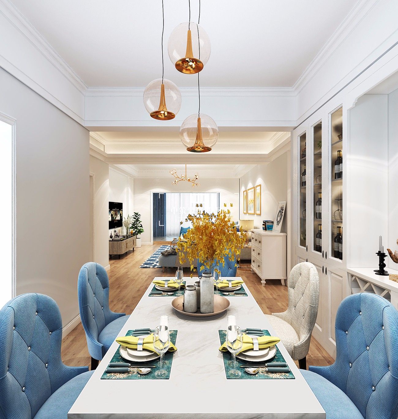 本案是新婚小兩口婚房,希望是一個舒適安逸的環境,營造一種溫馨甜蜜的家庭氛圍,所以本案的基礎色調采用了較為明亮的白色、米色調,用藍色和黃色加以點綴。